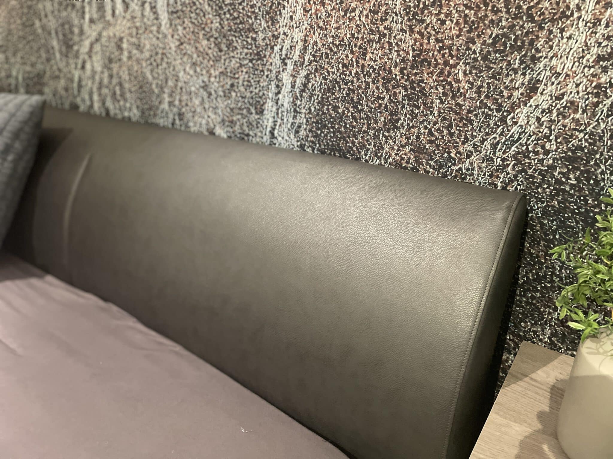 Modern ledikant met een RVS look frame in zwart leerdoek in de maat 180 x 200 cm.